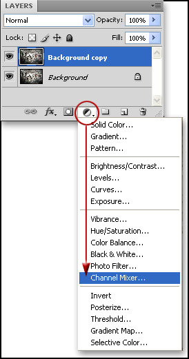 Click on the Adjustment Layer icon at the base of the Layers Palette and from the drop-down Adjustment Layer menu choose Channel Mixer.