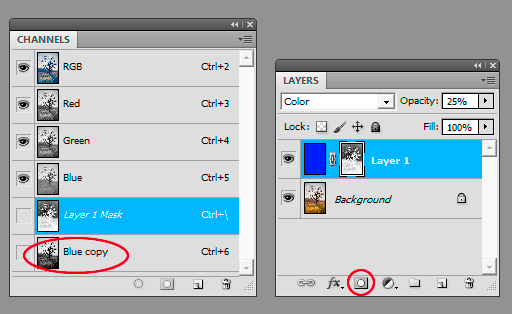 Hold down the Ctrl key and (left) click on the Channel Copy you made. ‘Marching ants' appear around the selection. Click on the Layer Mask icon at the base of the Layers palette and the selection will cut out around the mask. Note: In the Channels palette a new Alpha Channel will appear, showing the Layer Mask. |